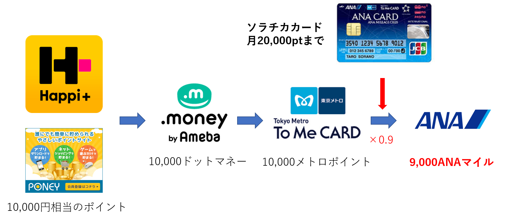 2018年3月31日までの最強パターンは、以下のハピタス或いはPONEYからドットマネーを経由して、ソラチカカードで、メトロポイントからANAマイルで90%でした。